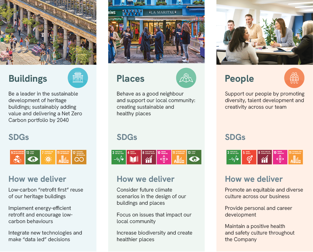 At Shaftesbury Capital we are committed to investing for the long term. We take a responsible and forward-looking approach, operating in an environmentally sustainable manner and supporting our local communities. Our goal is to become a Net Zero Carbon business by 2040 through an efficient “retrofit first” re-use and management of buildings. Re-using and enhancing existing buildings, rather than demolition and redevelopment, recognises that our buildings are long term carbon stores. Our sustainable approach increases energy efficiency whilst avoiding carbon emissions and use of materials associated with new construction.